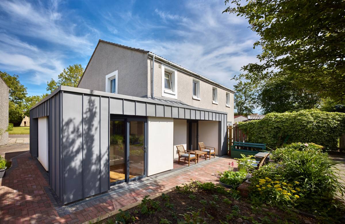 A single story, wrap around extension, fully clad in grey zinc including a grey zinc roof giving a stunning, unique look.